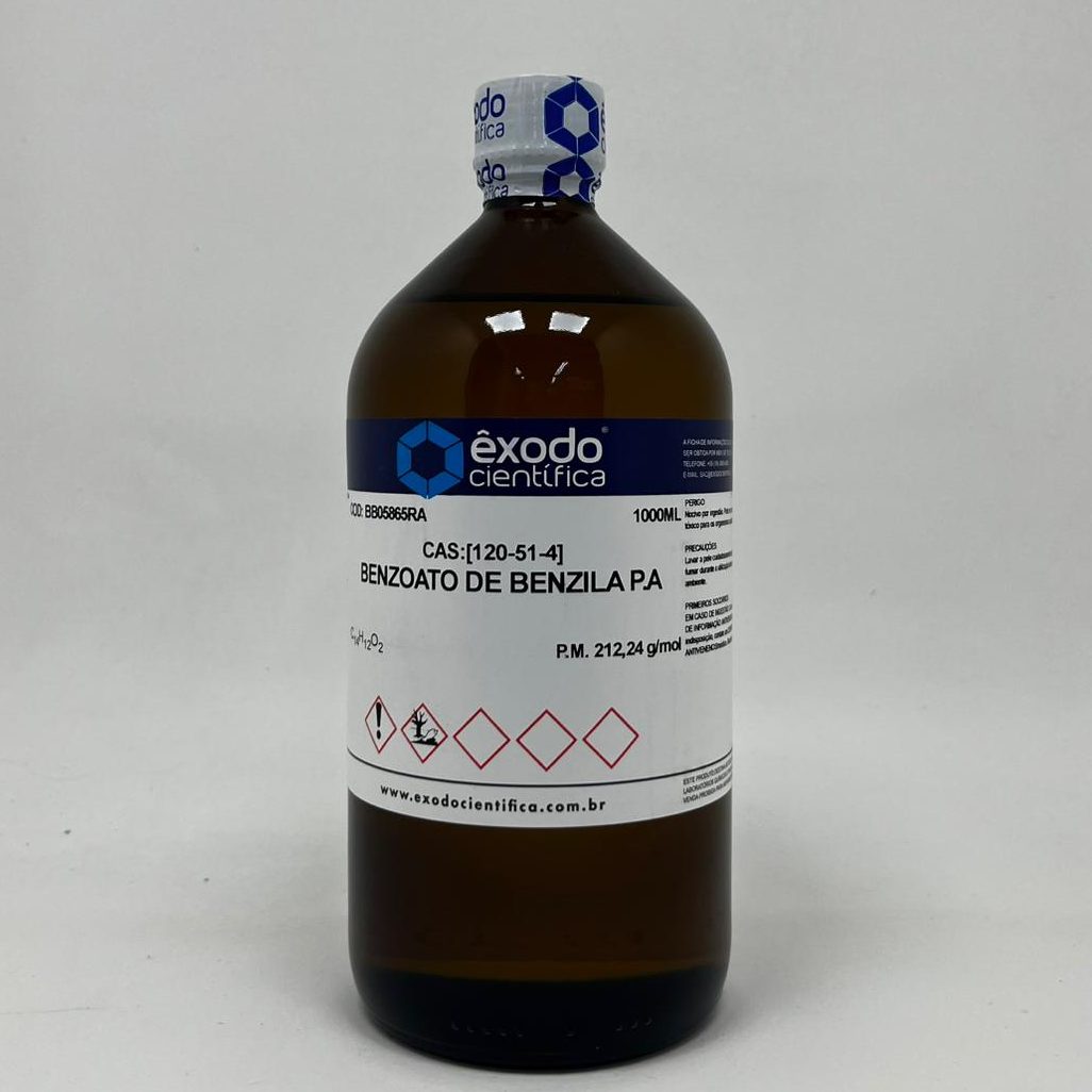 O Benzoato de Benzila é um composto orgânico sintético que se apresenta como um líquido oleoso, límpido e incolor, ou em temperaturas mais baixas, pode solidificar em uma massa cristalina. É o éster do ácido benzoico com o álcool benzílico. A designação P.A. (Para Análise) e a pureza mínima de 99% indicam um grau de alta pureza, adequado para aplicações que exigem especificações rigorosas, como em laboratórios de pesquisa, formulações farmacêuticas e cosméticas onde a qualidade e a ausência de impurezas são cruciais para a eficácia e segurança do produto final. É amplamente reconhecido por suas propriedades acaricidas e pediculicidas, além de atuar como solvente e fixador em diversas aplicações.