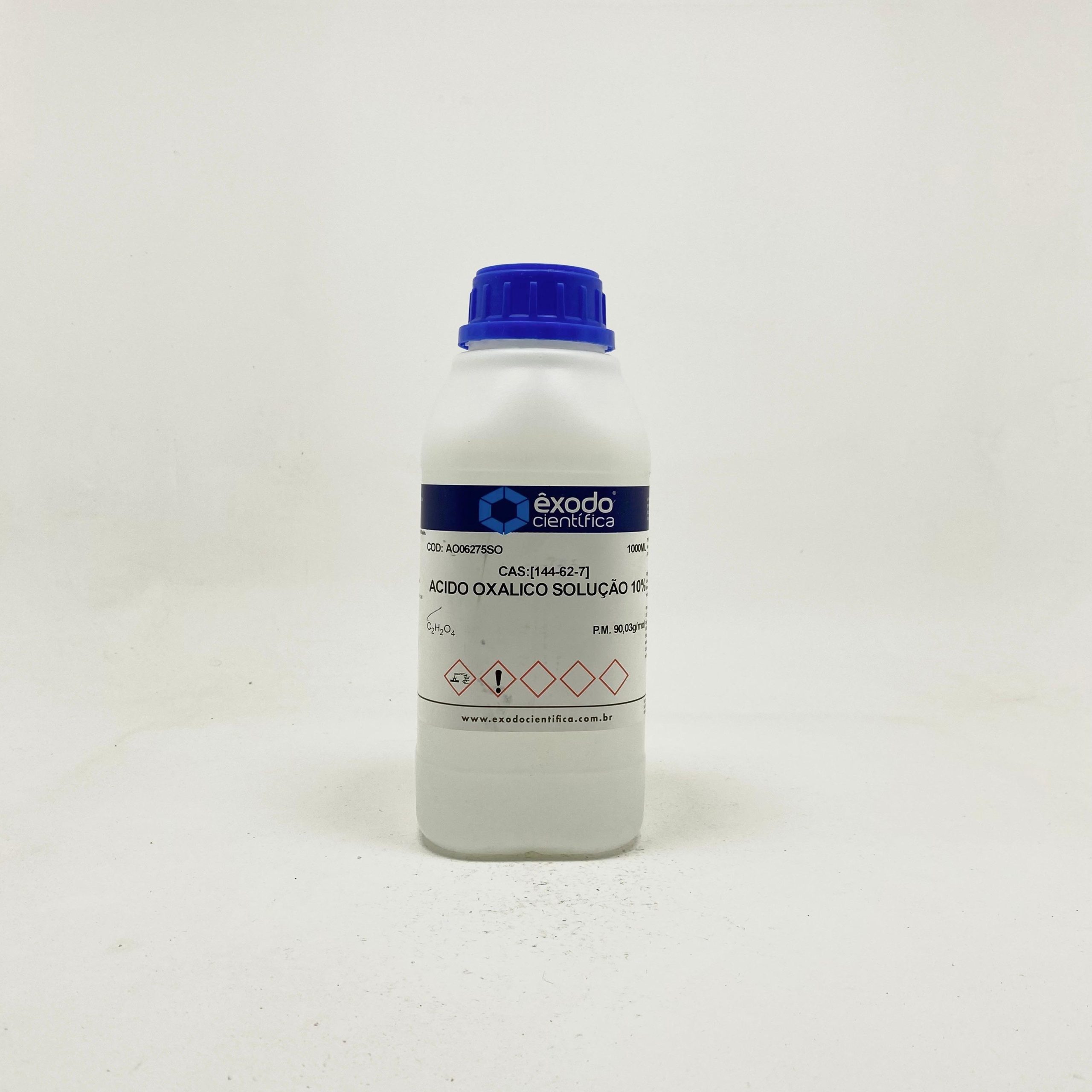 A Solução 10% de Ácido Oxálico é uma solução aquosa de Ácido Oxálico, um ácido dicarboxílico orgânico forte encontrado naturalmente em muitas plantas (como ruibarbo, espinafre e acelga). A concentração de 10% (m/m ou m/v) indica que há 10 gramas de ácido oxálico para cada 100 gramas ou 100 mL de solução. Embora seja uma solução diluída, o ácido oxálico mantém suas propriedades tóxicas características e requer manuseio cuidadoso.