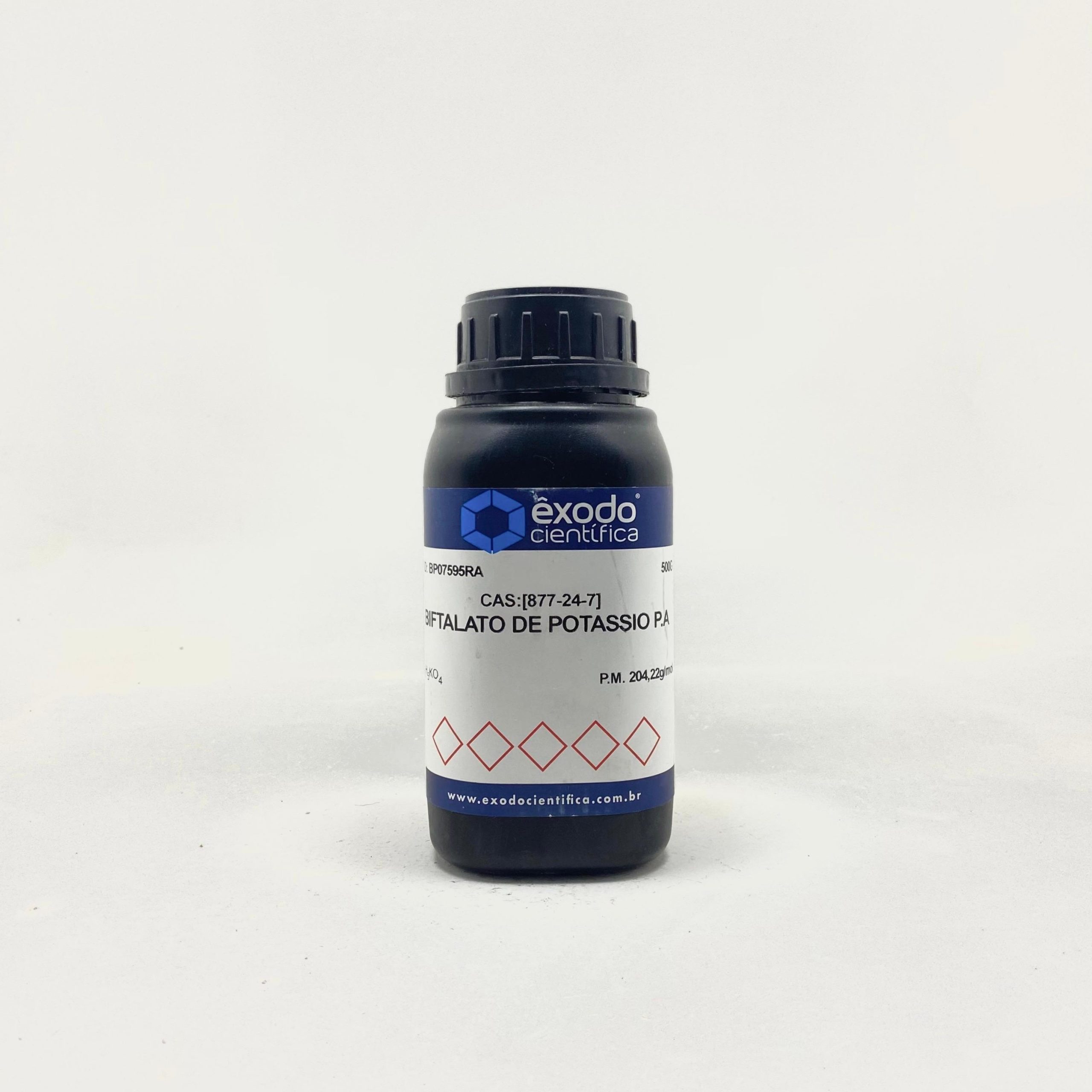 O Biftalato de Potássio P.A. 99%, também conhecido como Ftalato Ácido de Potássio ou KHP (Potassium Hydrogen Phthalate), é um sal ácido orgânico que se forma a partir do ácido ftálico e potássio. A designação \”P.A. 99%\” (Para Análise, com pureza mínima de 99%) indica que este produto possui um altíssimo grau de pureza, o que o torna um padrão primário de excelência.